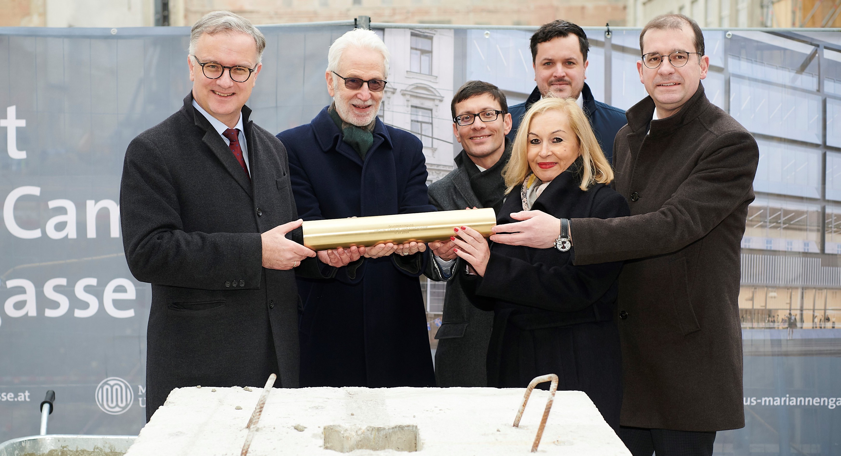(Vienna, 17th January 2023). Today, representatives of the Ministry of Science, the Medical University of Vienna, and the Bundesimmobiliengesellschaft (federal property company) laid the symbolic foundation stone for the MedUni Campus Mariannengasse in Vienna’s 9th district. Science Minister Martin Polaschek, the MedUni Wien Rector Markus Müller, and BIG-CEO Hans-Peter Weiss emphasised the importance of the large construction project which should secure the future, and continuation, of the highest-level medical research and teaching in Vienna. Hitherto scattered pre-clinical facilities will be concentrated in an area of around 35,000 sq.m. at the new site, and state-of-the-art teaching facilities will also be created.