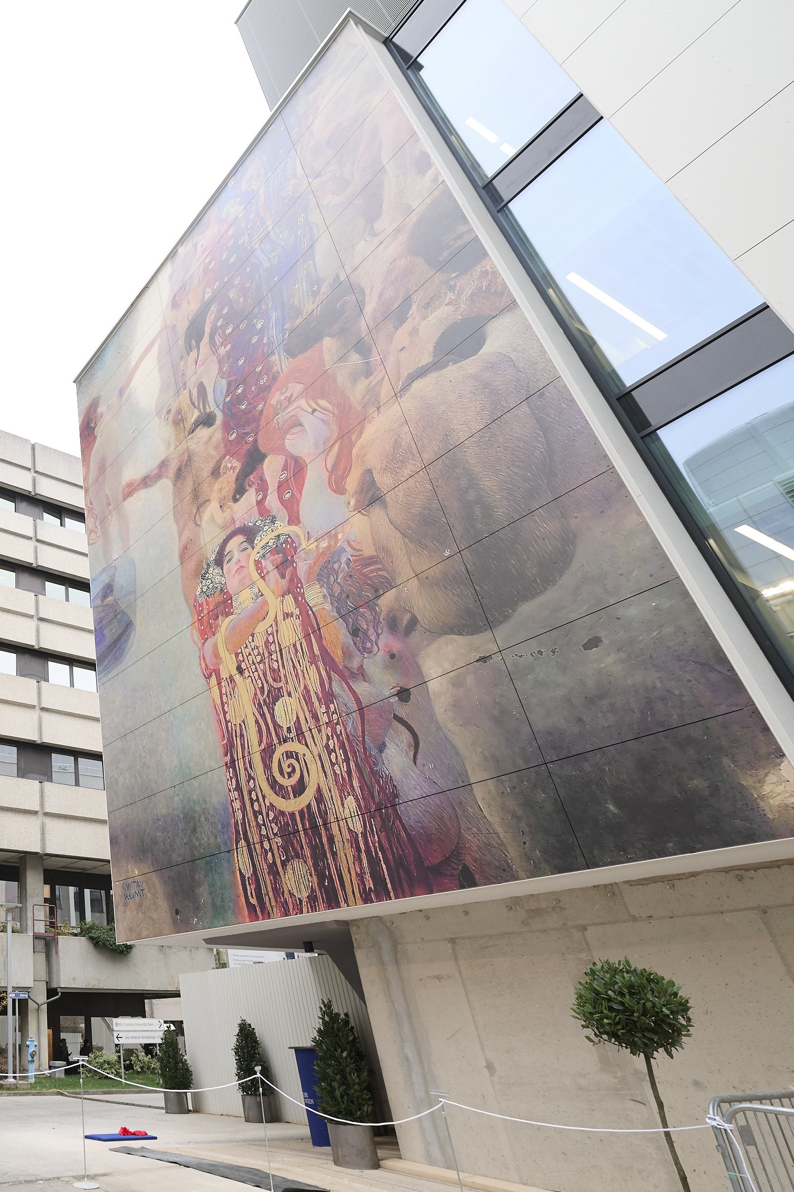Gustav Klimt painted the monumental painting “Medicine” around 1900. Originally commissioned by the Ministry of Education as one of the “faculty paintings” for the ceiling design of the University of Vienna's ceremonial hall, it never reached its final destination due to the massive criticism the paintings received from the ministry and the university, but also from the public. After being looted by the National Socialists, the originals of the faculty paintings were lost forever in a fire in May 1945; only drafts and black-and-white photographs have survived. Colored details are only known of the red and gold figure of Hygieia. With the help of artificial intelligence, the Belvedere and Google Arts & Culture reconstructed the colors of Klimt's faculty paintings in the joint project “Klimt versus Klimt”. The result of this reconstruction can now be seen on the façade of the new Anna Spiegel research building on the MedUni Vienna General Hospital campus.