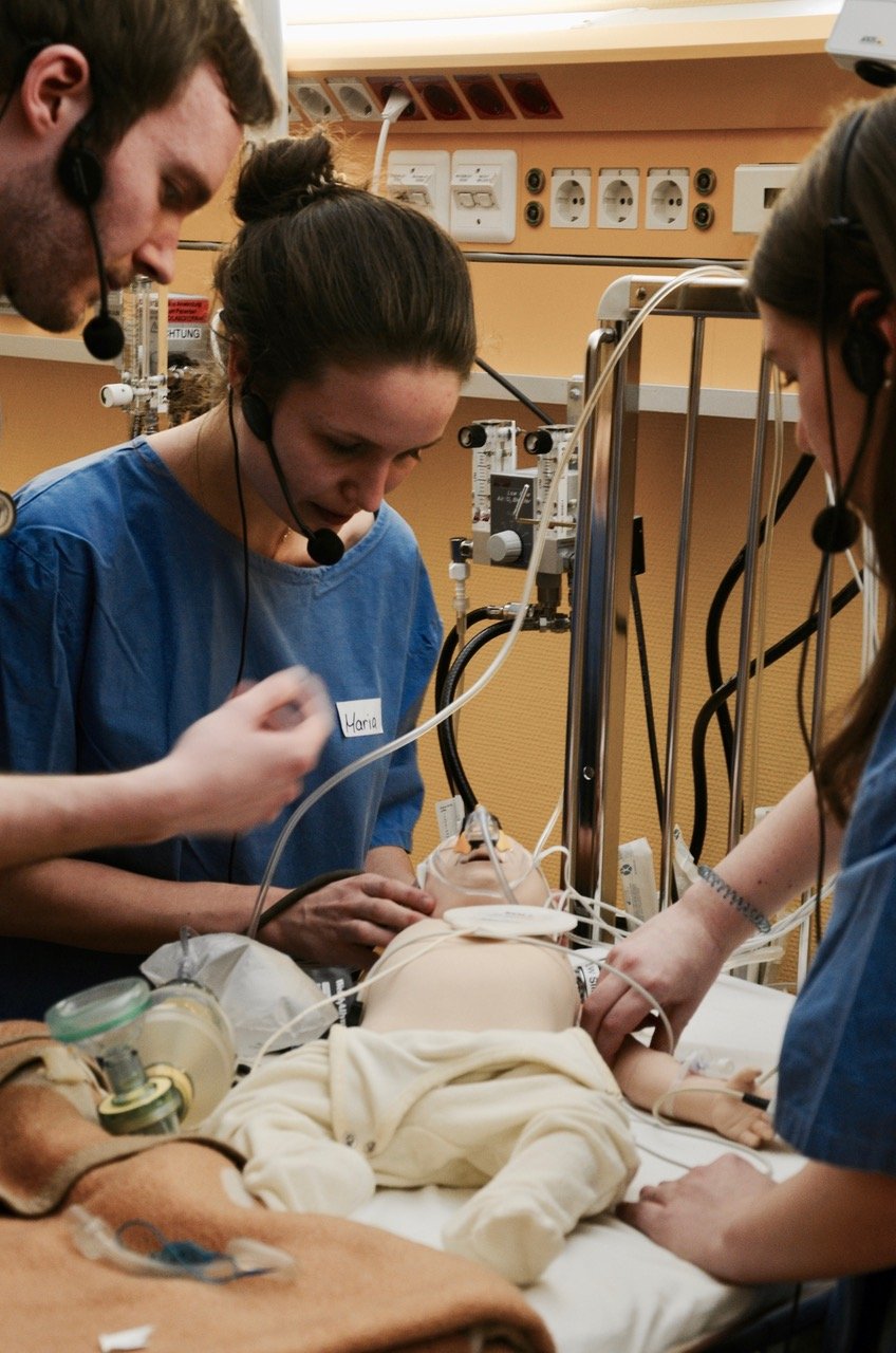 A brief introduction on the subject of critically ill children is followed by practical training on the simulation dummy. Paediatric emergencies are practised on the "SimBaby" in the simulation room at the Department of Pediatrics and Adolescent Medicine. The scenarios are videoed and then discussed, using video analysis and structured evaluation (debriefing), with the focus on communications and teamwork.