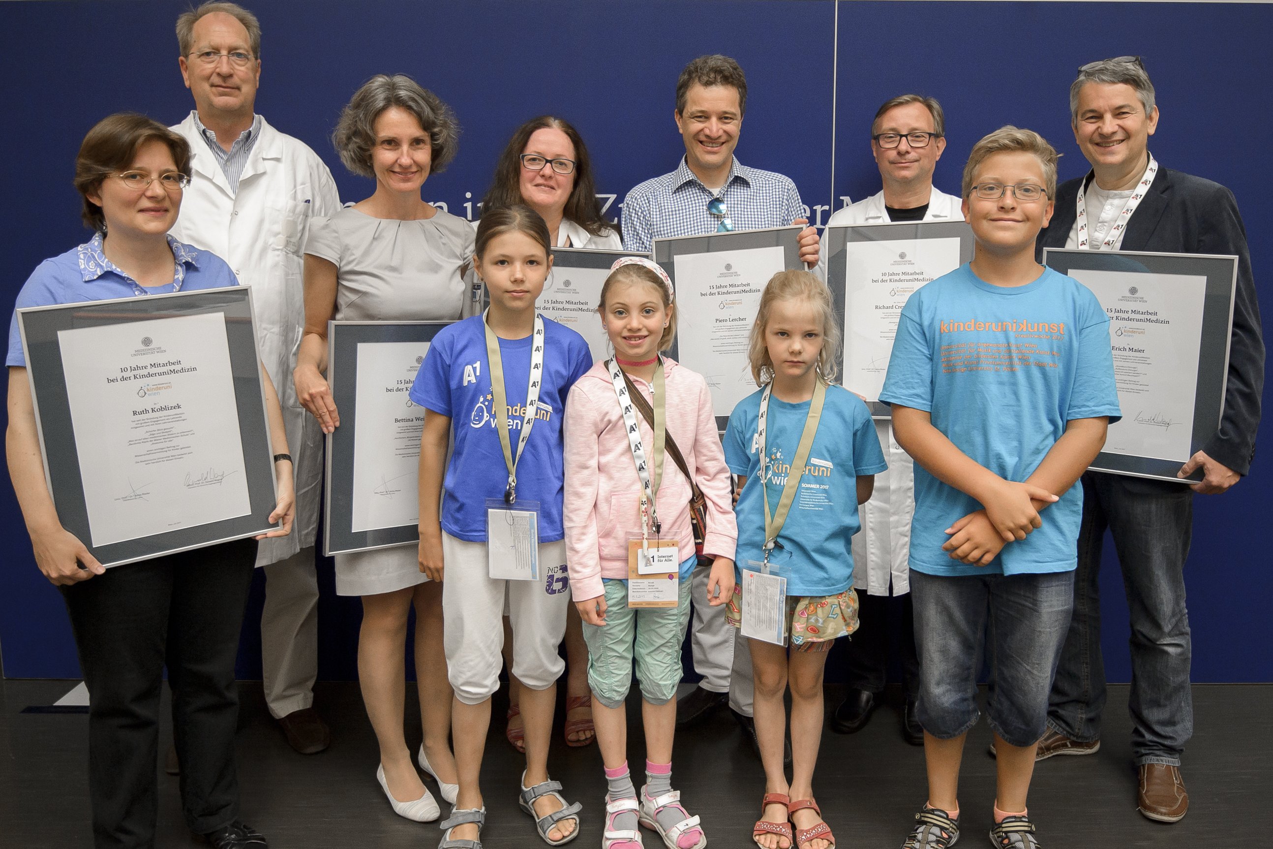 Also, seven teachers, who have now been teaching at KinderuniMedizin for 15 and 10 years respectively, were honoured on Monday: Piero Lercher (lectures on Life records/How do I grow tall, strong, smart and invincible?), Erich Maier (Basic course on surgery/Why do I need an operation? Where does tummy ache come from?) and Daniela Dörfler/Bettina Weidinger (Palpitations, tingling and sweet dreams) have been involved right from the start. Richard Crevenna (Observing movement/Biofeedback), Ruth Koblizek (Sharp eye needed/What do medical images show us?) and Irene Lang (Where does blood flow to?) have been teaching the children for 10 years.