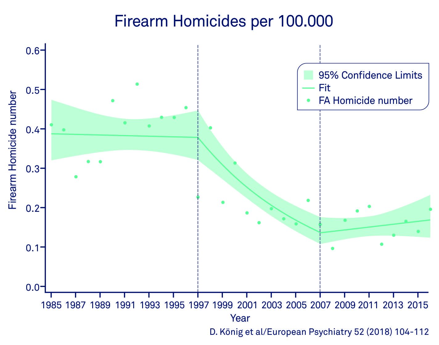 The pattern of firearm-related murders is even more striking. Between 1985 and 1998, the percentage of firearm-related murders increased from 4.1% to 9.0% and, following the firearm legislation reform, fell by around 6.4% a year. In contrast, since 2008 one can see an annual increase of around 10%.