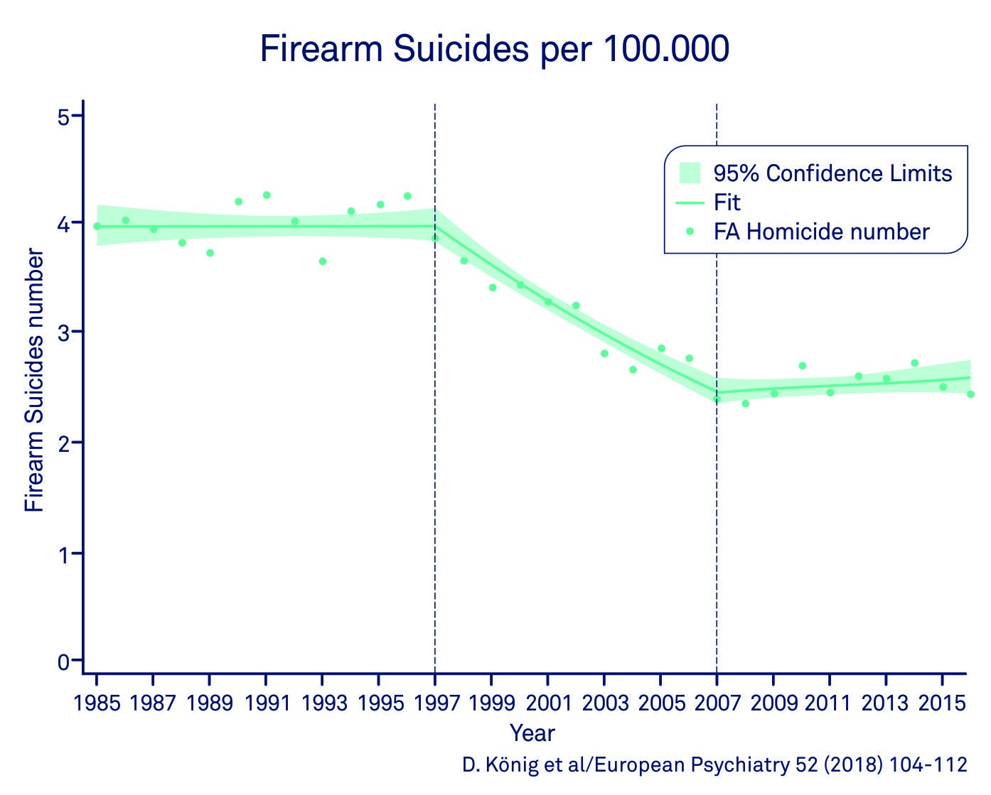 Whereas the proportion of firearm-related suicides rose continuously from 14.3% to 18.7%, between 1985 and 1998, following the 1997 firearm-legislation reform, it dropped continuously to 15.5%. After 2008 it rose again, reaching 17.7% in 2016.