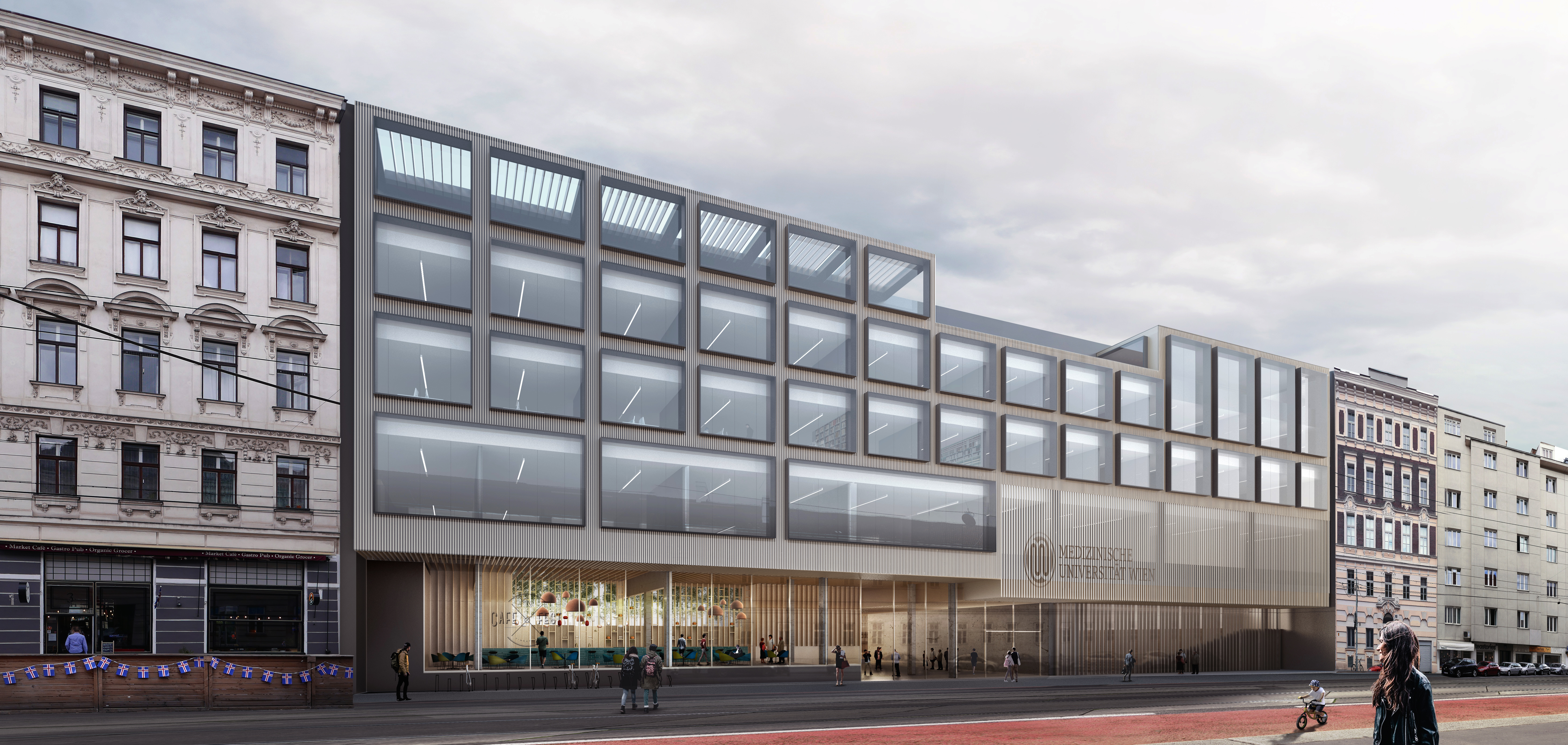 The winning project was chosen by a jury made up of representatives from the BMBWF, MedUni Vienna, BIG, the City of Vienna and the Austrian Chamber of Architects and Civil Engineers. Jury chairman Elsa Prochazka (Austrian Chamber of Architects and Civil Engineers and BIG Architectural Advisory Board) justified their decision as follows: "The public facilities on the ground floor along Spitalgasse with cafe and the refectory located on the corner of Höfergasse/Rummelhardtgasse create an inviting setting for the campus. This adds value to the quarter as a whole. The route into the interior of the building [...] links Spitalgasse to the square on Rummelhardtgasse in an exemplary fashion. At the same time, the design makes it easy to orient oneself, despite the complex footprint. […] The idea of creating a central wing that is able to respond optimally to the requirements of laboratory use and houses most of the necessary laboratory space is both unique and very impressive. This solution not only meets spatial and functional needs but also offers a high degree of flexibility and variability for future changes of use, which are an intrinsic feature of universities.