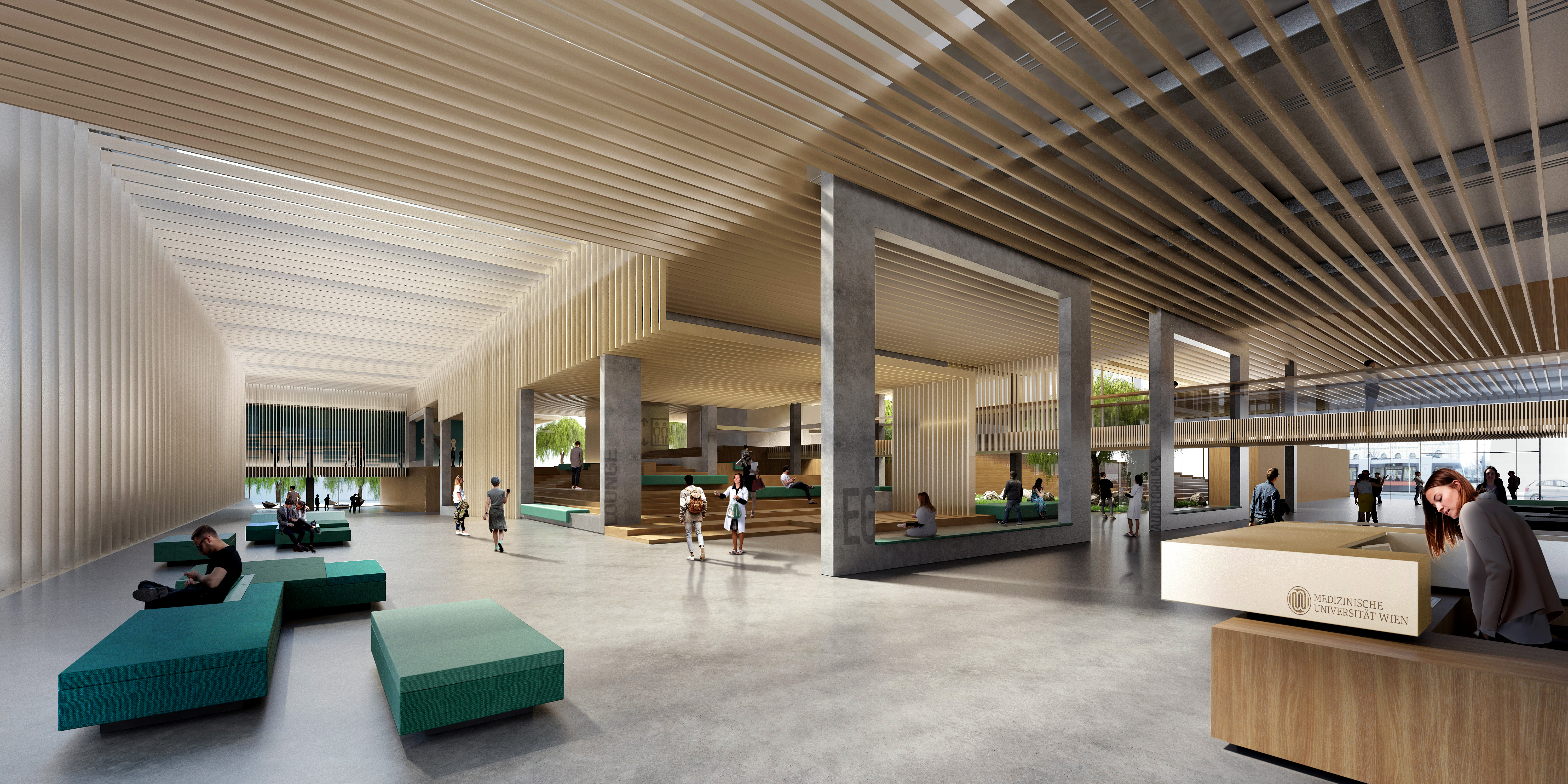 "Robust materials such as terrazzo for the floors and exposed concrete for the support structure will be counterbalanced by warm wood for the ceiling strips and on the floor of the lounge areas, combined with the colourful, textile surfaces of the seating. The interplay between daylight, artificial light and the green of the interior courtyards will create varied and diverse spaces and atmospheres," say Delugan Meissl Associates Architects and ArchitekturConsult, describing the interior design of the hall.