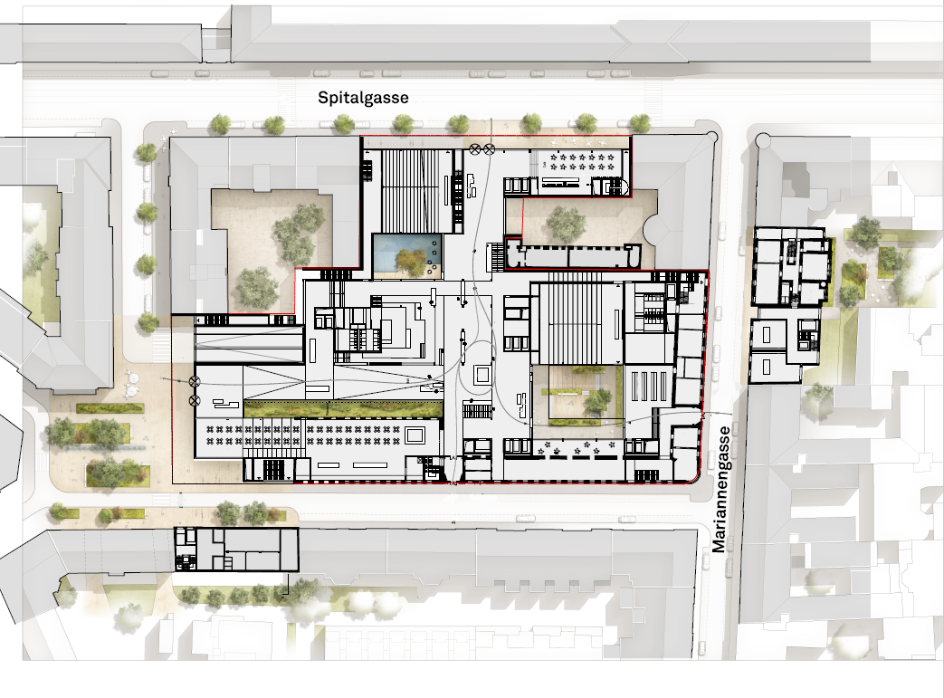 The new campus will occupy the site of the former Wien Energie premises between Mariannengasse, Höfergasse, Rummelhardtgasse and Spitalgasse and comprise several houses, some of which are listed. In order to link up the complex of buildings between Spitalgasse in the east and Höfergasse in the west, the architects' winning design provides a central hall on the ground floor, running between the block of houses on Spitalgasse, a central wing and the buildings on Höfergasse. The new hall or aula provides a central space and a route through the different parts of the building. In order to compensate for the different street levels of the buildings, the hall will have terraces, seat-steps and ramps, which can also be used as "furniture" for informal discussions, for working or for relaxing.
