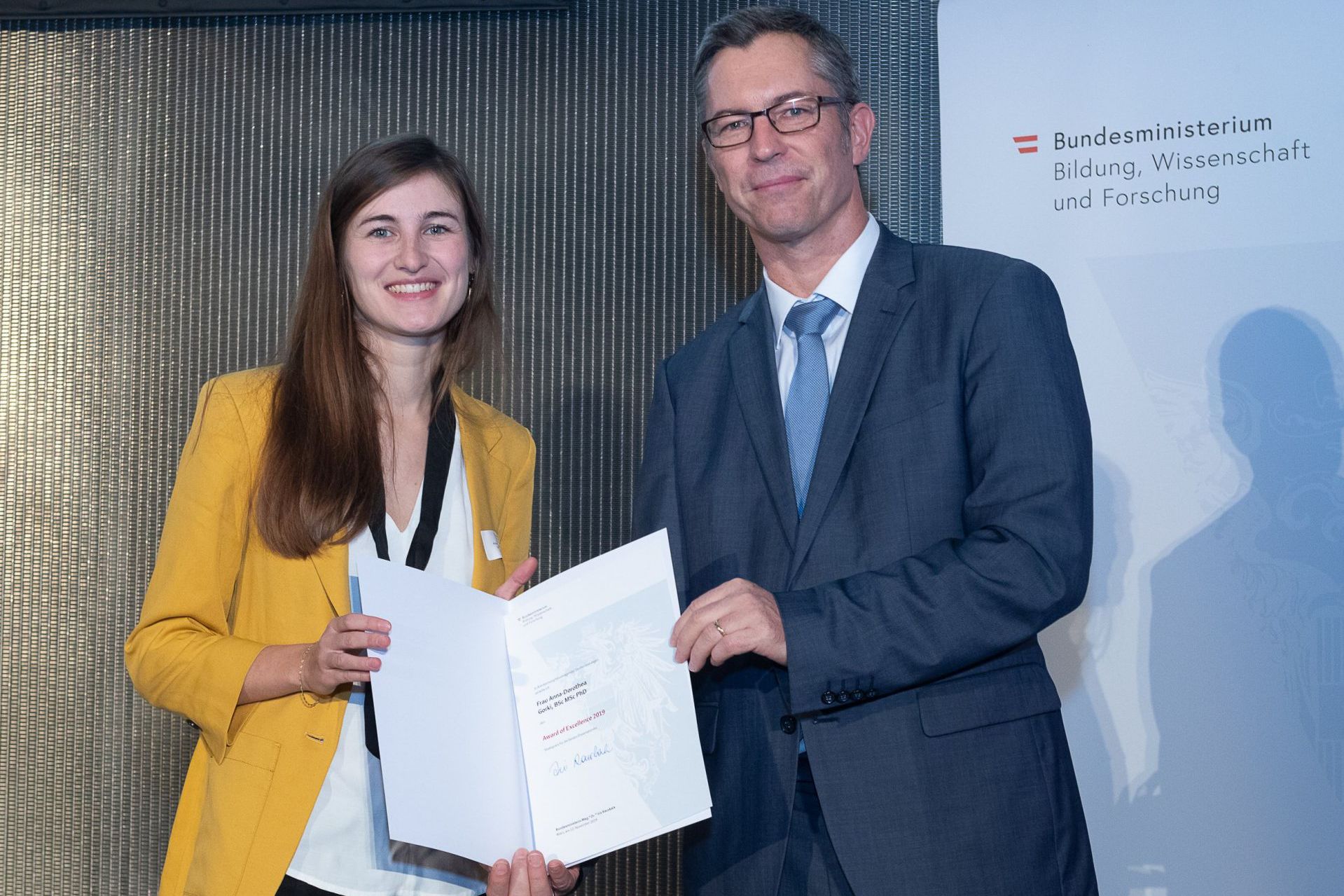 Der Award of Excellence des Bundesministeriums für Bildung, Wissenschaft und Forschung wird seit 2008 an die 40 besten Absolventinnen und Absolventen von Doktoratsstudien der wissenschaftlichen und künstlerischen Universitäten des vergangenen Studienjahres vergeben. Die Vorschläge dafür kommen von den Universitäten.