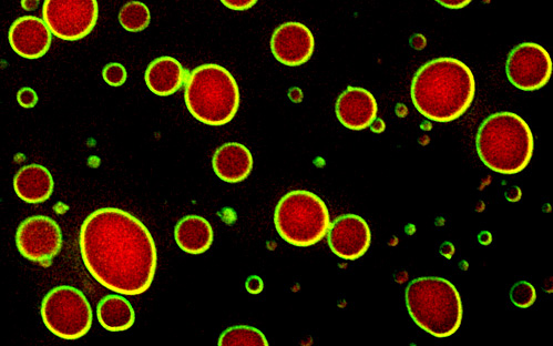 DNA is folded into a material called chromatin, which is mostly composed of DNA wrapped around histone proteins. Enzymes can modify histones and thereby affect chromatin structure, which influences whether a gene is active or not. Reporting in Nature, Alwin Köhler’s team discovered that Bre1, an enzyme that modifies histone proteins with ubiquitin, exists in a peculiar material state. Bre1 binds another protein, called Lge1 (Large 1), which displays an unusual behavior when viewed under the microscope: Lge1 forms droplets, which are colliding and coalescing. “Solid structures don’t do that; only liquids can” says Laura Gallego, a first author of the study.