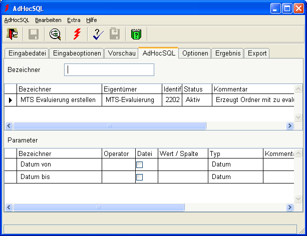 In der Tabelle „Bezeichner“ sollte nun eine Zeile mit „MTS Evaluierung erstellen“ aufscheinen. In der unteren Tabelle „Parameter“ sollten zwei Zeilen - „Datum von“ und „Datum bis“ - angezeigt werden. Dort muss in der Spalte „Wert / Spalte“ das Beginn- bzw. Enddatum des Evaluierungszeitraums angegeben werden, z.B. „1.1.2015“.