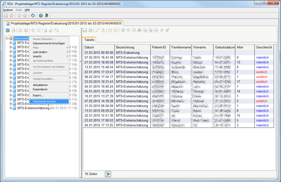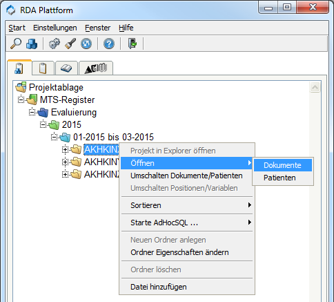 Der Ausgangspunkt für das Drucken der MTS-Dokumente ist die Sidebar. Hier muss zunächst zum gewünschten Ordner navigiert werden. Subordner können angezeigt werden, indem auf das „+“ vor dem Ordner-Symbol geklickt wird. Der Ordner mit der gewünschten AKH-ID muss dann angewählt werden, sodass dieser blau markiert ist. Durch Klicken mit der rechten Maustaste auf den Ordner und Auswahl von „Öffnen“ und dann „Dokumente“ werden die Dokumente, die in diesem Ordner liegen, in einem neuen Fenster geöffnet.
