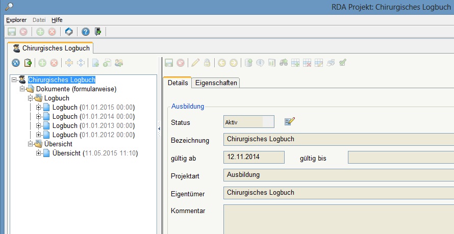 In dem neuen Fenster mit dem Titel "RDA-Projekt Chirurgisches Logbuch" finden Sie die Dokumente die zu Ihrem Logbuch gehören:
