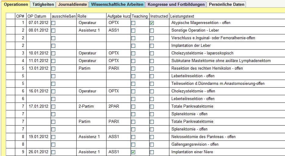 Auf dem Blatt "Operationen" befindet sich die Auflistung aller Operationen dieses Jahres.