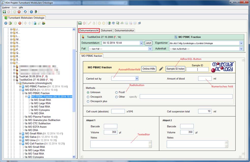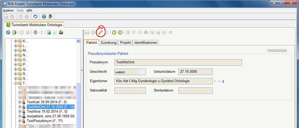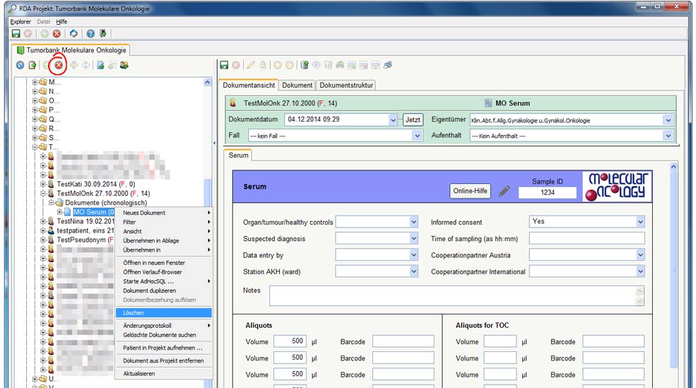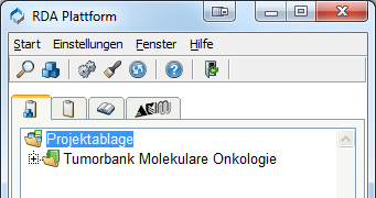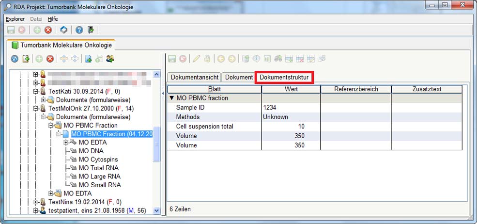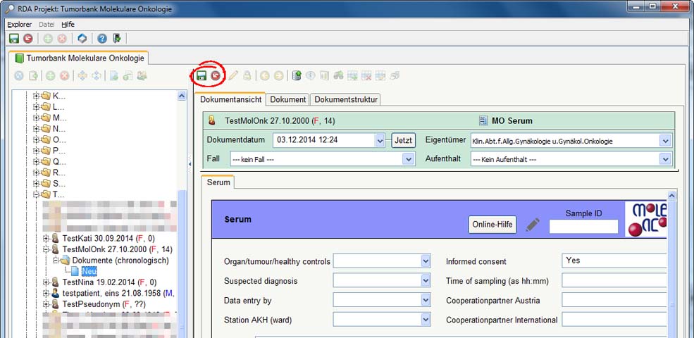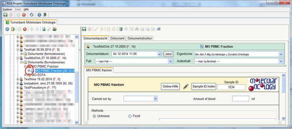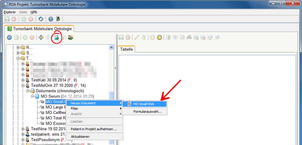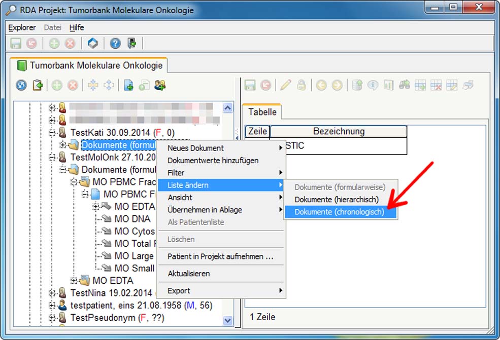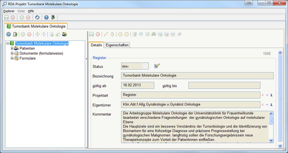 Klicken Sie doppelt auf "Tumorbank Molekulare Onkologie" in der Sidebar um in die Ansicht des Registers zu navigieren.