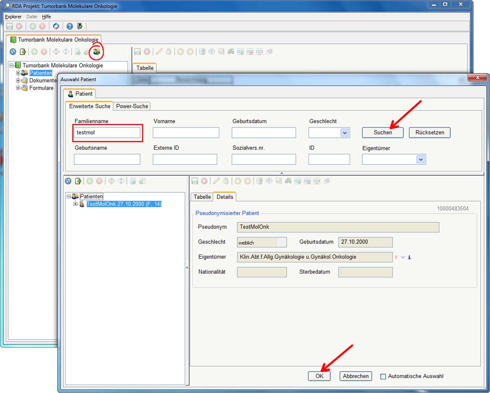 Um einen Patienten aus dem AKH in Ihr Register aufzunehmen, klicken Sie auf das Patienten-Icon und suchen diesen im oberen Suchfenster. Markieren Sie den gewünschten Patienten und klicken Sie auf "OK".