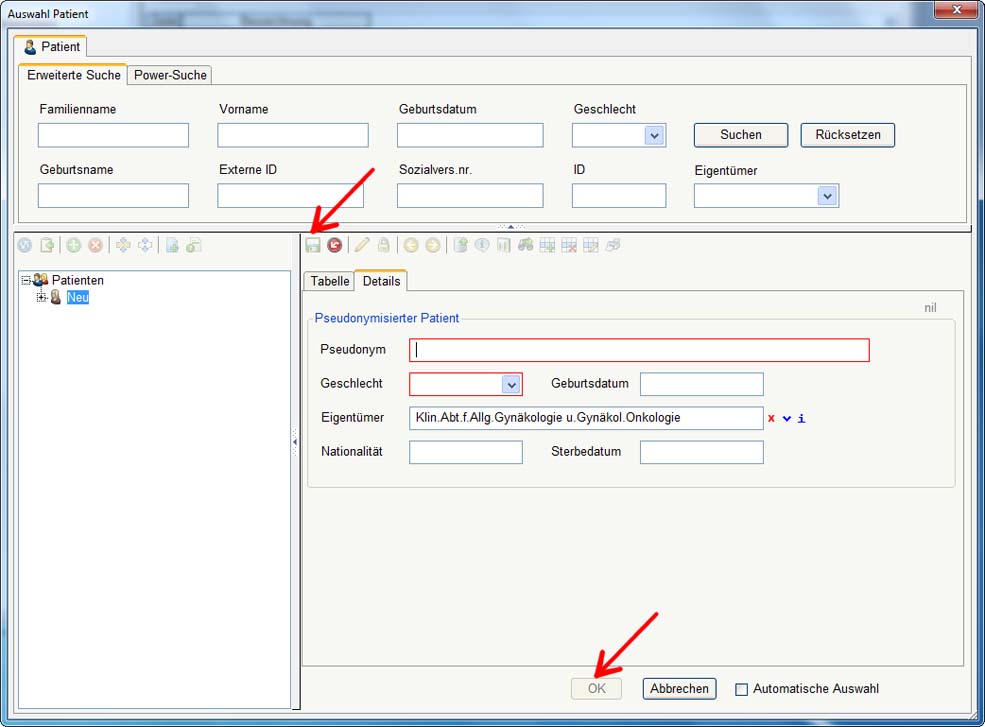 Das Pseudonym, das Geschlecht und der Eigentümer müssen ausgefüllt werden, danach kann der Patient/die Patientin durch Klick auf das Disketten-Symbol gespeichert werden. Danach drücken Sie bitte „OK“, um den Patienten ins Projekt aufzunehmen. Es erscheint wieder die Meldung, ob der Patient ins Projekt aufgenommen werden soll.