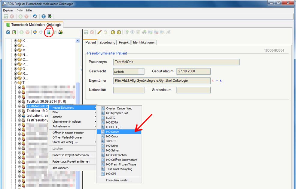 • mittels der rechten Maustaste auf den Patienten -> Neues Dokument. Die dem Register zugeordneten Formulare werden automatisch angeboten.
