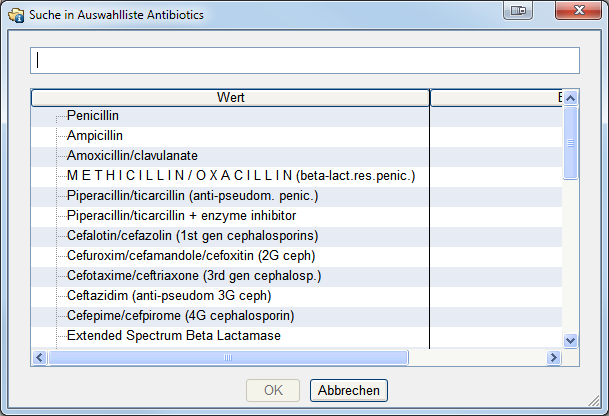 F6 ist eine Suchfunktion innerhalb der Auswahllisten. Klicken Sie in einem Auswahllistenfeld F6. Es erscheint ein Fenster zur Suche in der Auswahlliste. Geben Sie den Namen oder einen Teil des Namens eines Antibiotikums ein. Es werden die in Frage kommenden Ausprägungen aufgelistet. Klicken Sie die gewünschte Auswahl an und verlassen Sie mittels "OK" das Suche-Fenster.