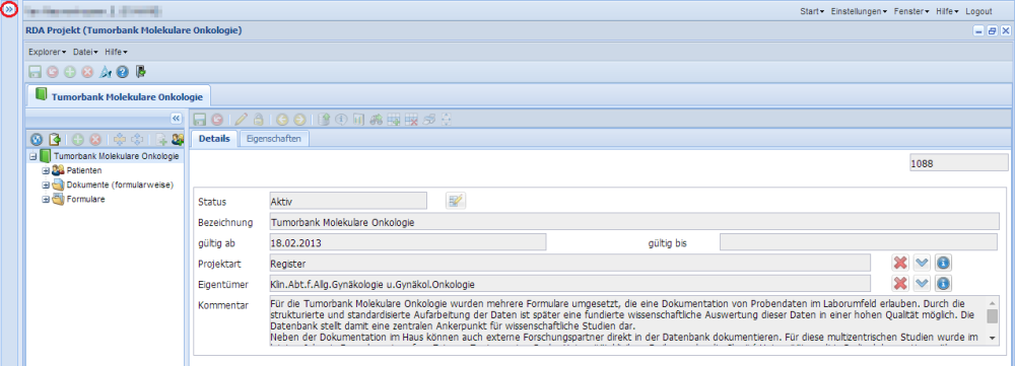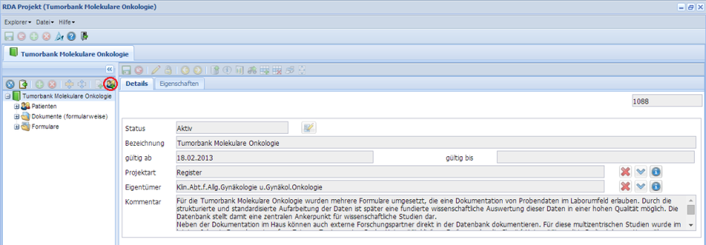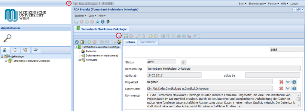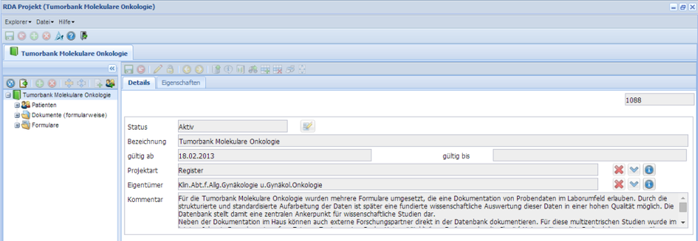 Was im rechten Fenster angezeigt wird, ist abhängig von der Auswahl links. Wenn z.B. "Tumorbank Molekulare Onkologie" ausgewählt ist, ist rechts die Projektbeschreibung sichtbar. Im rechten Feld können abhängig von der Zugriffsrechten auch Änderungen durchgeführt werden.