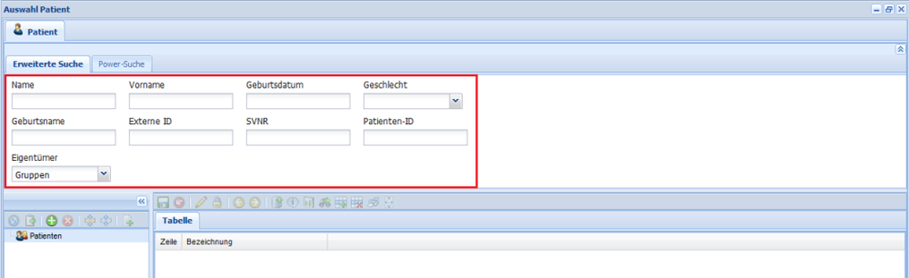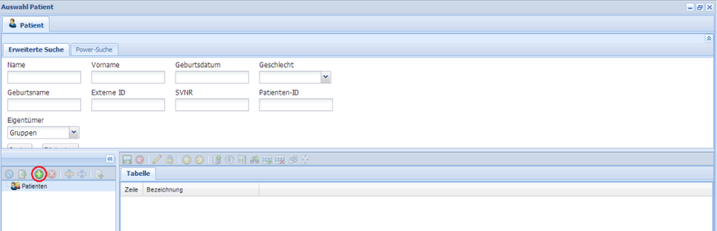 • Öffnet das Patienten-Fenster, dort kann man nach Patienten suchen oder Neue anlegen