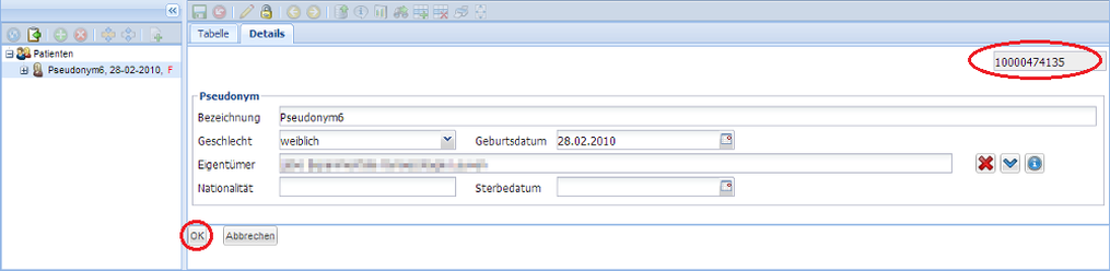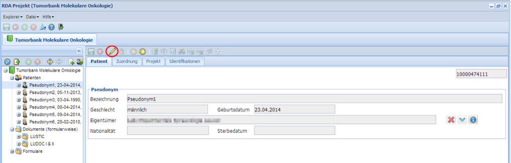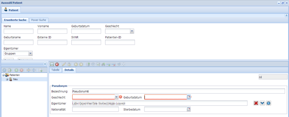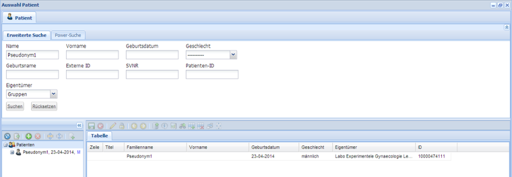 Geben sie das gesuchte Pseudonym im "Name"-Feld ein und drücken Sie Enter. Im unteren Fenster werden alle gefundenen Patienten angezeigt. Wenn nur der Anfang des Names bekannt ist, kann man das durch Eingabe eines Prozentzeichens ausgleichen, z.B. "Pseu%". Durch Doppelklick auf den gewünschten Patienten wir er im "Patienten"-Ordner geöffnet.