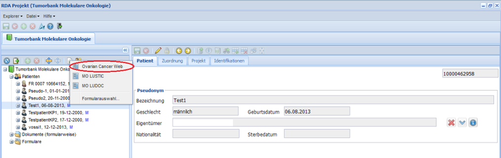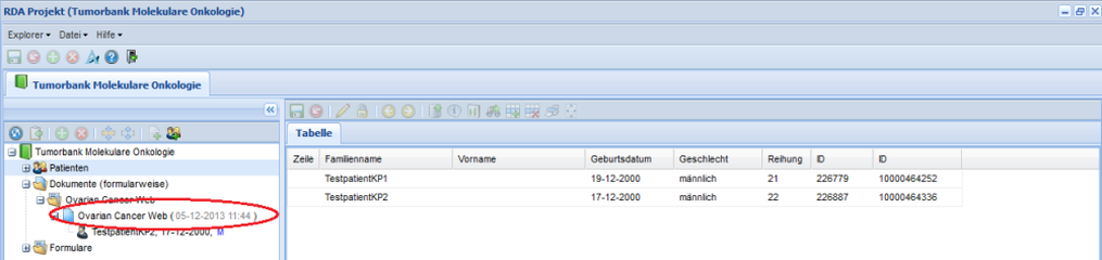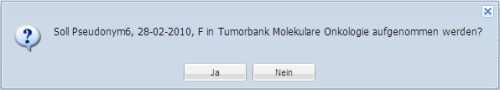 Bestätigen mit „Ja“ nimmt den Patienten in das Projekt auf, er scheint damit im Ordner "Patienten" der "Tumorbank Molekulare Onkologie" auf.
