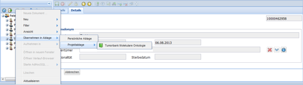 Sollte der Patient nicht in der Patientenliste zu finden sein, obwohl er angelegt wurde, kann man ihn später immer noch zum Projekt hinzufügen. Dafür muss man in das Patientenauswahlfenster wechseln und den Patienten suchen. Hat man den Patienten gefunden, dann wird über das Auswahlmenü der rechten Maustaste „Übernehmen in Ablage“ → „Projektablage“ → „Tumorbank Molekulare Onkologie“ ausgewählt, um den Patienten in das Projekt aufnehmen.