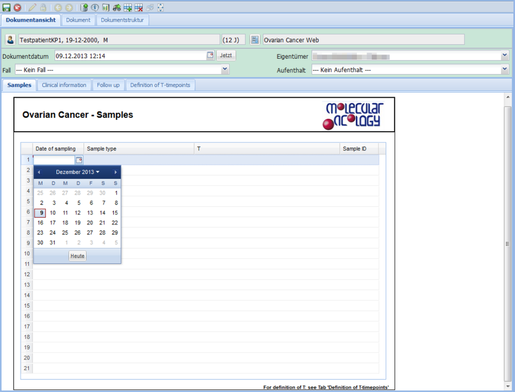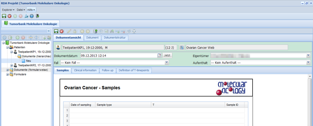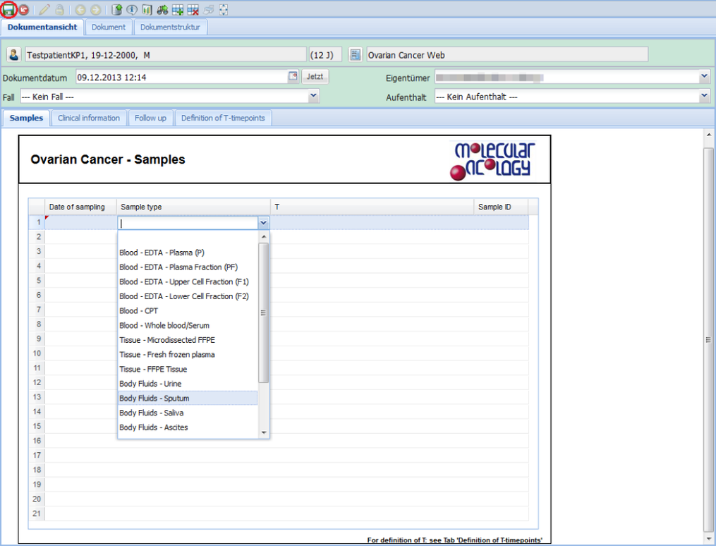 Manche Formulare haben mehrere Blätter. Diese sind über die Reiter im oberen Bereich des Dokuments zugänglich (z.B. Samples, Clinical information, Follow up, Definition of T-timepoints).