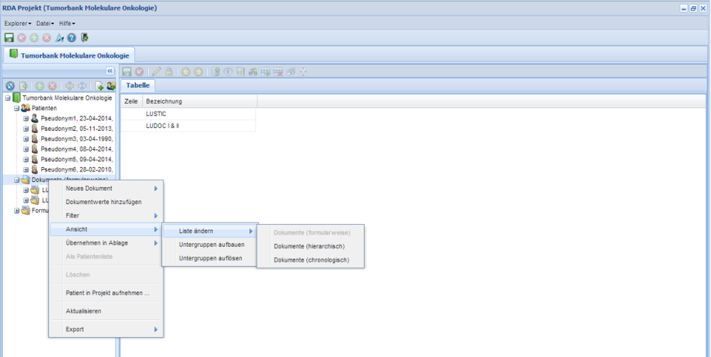 Die Art der Sortierung der Dokumente kann angepasst werden. Durch Rechtsklick auf den "Dokumente"-Ordner öffnet sich ein Menü. "Ansicht" und "Liste ändern" anwählen. Hier kann man zwischen "Dokumente (formularweise)," "Dokumente (hierarchisch)" und "Dokumente (chronologisch)" wählen. Man kann auch alle Untergruppen (bzw. Unterordner) auflösen und diese danach wieder aufbauen.