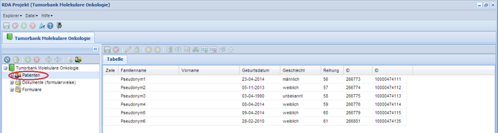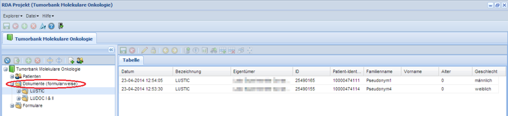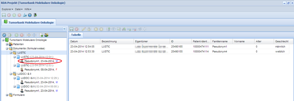Durch Selektion von "Patienten" wird rechts eine Liste aller Projektpatienten angezeigt. Durch Klicken auf die Überschriften der Spalten können die Dokumente unterschiedlich geordnet werden. Öffnen eines Dokument erfolgt durch Doppelklick des Dokuments in der Liste rechts.