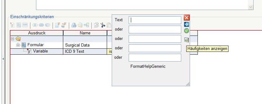 Für die Formulierung von Einschränkungen für Textvariablen gibt es noch eine andere Möglichkeit. Wählen Sie den Operator "ist enthalten in" und klicken Sie in die Spalte "Vergleichswert" daneben. Es öffnet sich ein Fenster, das die Veroderung von Textwerten unterstützt. Sie können die Texte direkt eingeben oder sich die Häufigkeiten der bereits dokumentierten Werte anzeigen lassen und die gewünschten Werte per Checkbox auswählen.