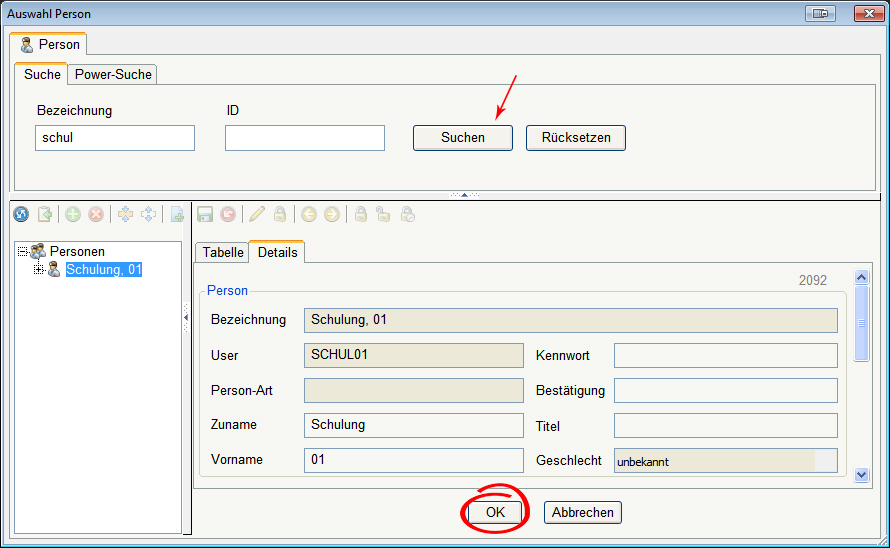 Gruppen, für die Sie eine Berechtigung haben, werden direkt angezeigt, wenn Sie ohne Eingabe im Suchfeld den Button "Suchen" betätigen. In unserem Beispiel legen Sie aber eine persönliche Abfrage an, indem Sie Ihren Namen eintragen oder über die Personensuche auswählen. Danach klicken Sie auf "OK".