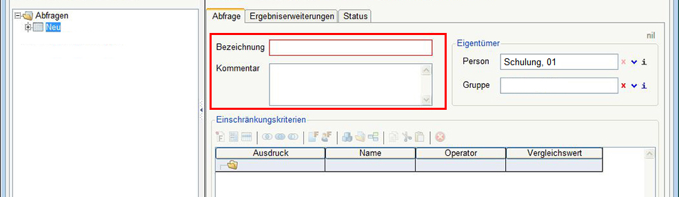 Geben Sie der Abfrage eine Bezeichnung.  Die Angabe von Eigentümer und Bezeichner sind Voraussetzung für das Speichern einer Abfrage. Wir empfehlen im Kommentarfeld den Zweck der Abfrage zu beschreiben, damit Sie später nachvollziehen können, zu welchem Zweck die Abfrage erstellt wurde.