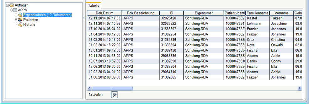 Durch Abfragen können Sie ihre Daten für eine Auswertung aufbereiten. Sie haben die Möglichkeit, nach Dokumenten zu suchen, bei denen der dokumentierte Wert einer bestimmten, von Ihnen definierten Auswahl entspricht. Sie können diese Auswahlkriterien mit anderen verknüpfen (z.B. das Alter das Patienten einschränken oder nur Dokumente in einem bestimmten Zeitraum auswählen). Danach können Sie zum Ergebnis Werte desselben oder eines damit in Beziehung stehenden Dokumentes hinzufügen. Zusätzlich können Sie auch Daten von anderen Dokumenten (z.B. Laborwerte) über die sogenannten "Ergebniserweiterungen" dazuholen. Diese Daten können sie dann exportieren und für ihre statistischen Auswertungen nutzen.