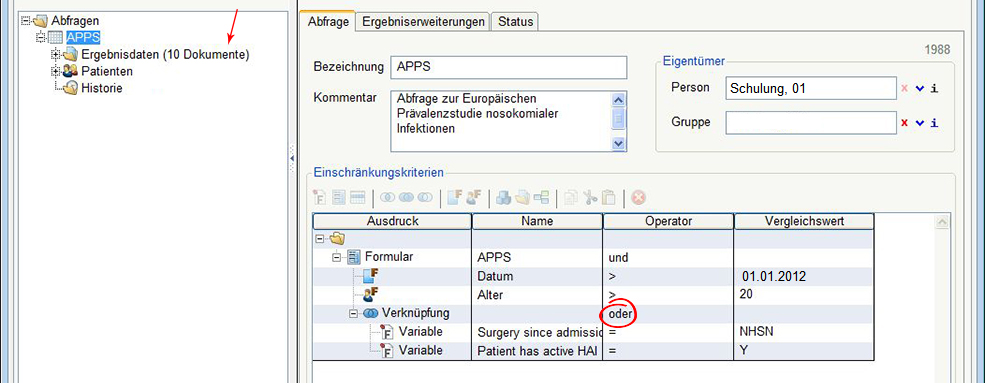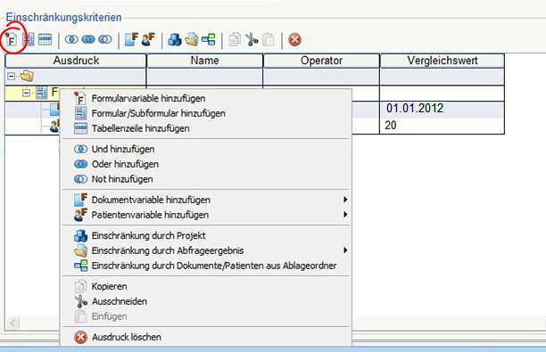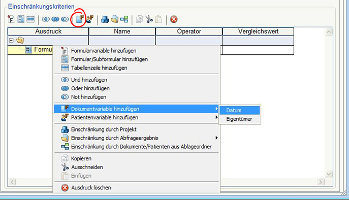 Standardmäßig wird für Abfragen eine UND-Verknüpfung angeboten. In unserem Beispiel zeigen wir eine Einschränkung über dokument- und patientenspezifische Variablen sowie Formularvariablen.