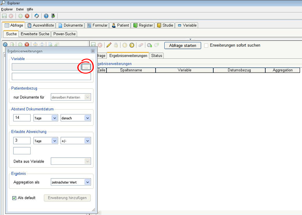 Achten Sie bei der Definition der Ergebniserweiterungen auf den festgelegten Zeitraum bezogen auf das Dokumentdatum des Ausgangsformulars und die Aggregation. Beim Hinzufügen von "Neue Erweiterung wie diese" wird die Aggregation wie für die ursprüngliche Variable definiert angeboten.