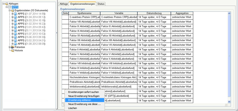 Wenn Sie das Ergebnis der Abfrage durch das Hinzufügen von Werten aus anderen Formularen (z.B. Laborbefund) erweitern möchten, dann wählen Sie den Reiter Ergebniserweiterungen.