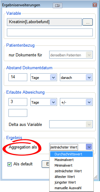 Unter Ergebnis > Aggregation können Sie z.B. den Durchschnittswert  oder den jüngsten Wert im definierten Zeitraum wählen. Über 'manuelle Auswahl' können Sie einen der angebotenen Werte in die Ergebnistabelle händisch einfügen.
