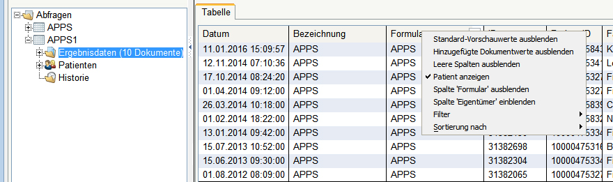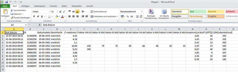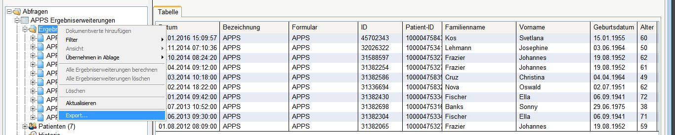 Das Ergebnis der Abfrage mit den gewählten Formularvariablen und den über die Ergebniserweiterungen hinzugefügten Laborvariablen können Sie via Rechtsklick auf den Ordner "Ergebnisdaten" im linken Bereich > Export  ... ins Excel exportieren.