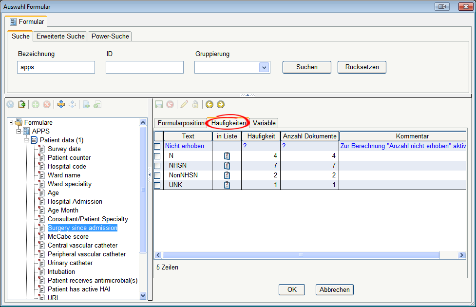 Es geht das unten dargestellte Fenster zur Variablensuche auf und Sie können das gewünschte Formular und die erste Variable auswählen, nachdem Sie auf die den Button mit den drei Punkten geklickt haben.  Zusätzlich müssen Sie den gewünschten Zeitraum für die Ergebniserweiterungen, bezogen auf das Dokumentdatum des primär gewählten Formulars, definieren. In unserem Beispiel ist das Ausgangsformular APPS.