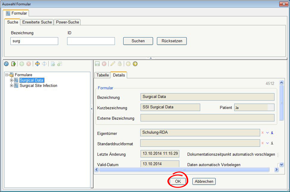 Klicken Sie auf das + vor dem gewählten Formular "Surgical Data" und wählen Sie die gewünschte Variable (hier "Elective") und klicken Sie auf "OK".