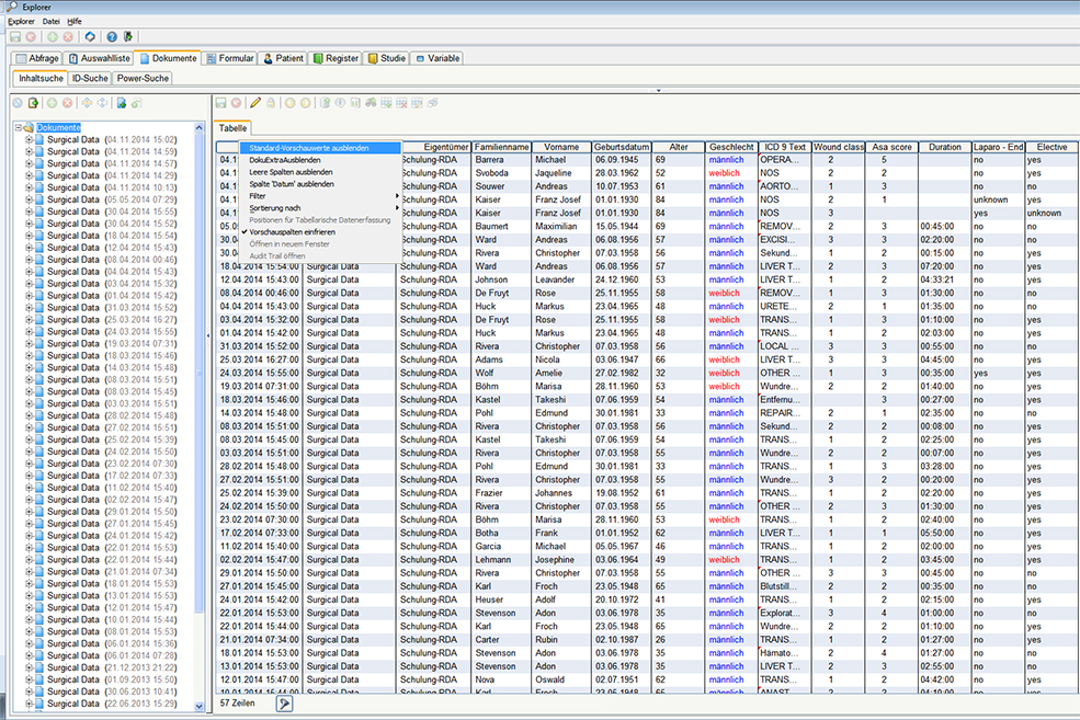 Für das Hinzufügen von Werten zu Variablen des gesuchten Formulars "Surgical Data" und der anderen Formulare, die mit diesem Formular in Beziehung stehen, klicken Sie mit der rechten Maustaste auf den Ordner Dokumente > Dokumentwerte hinzufügen. Über die Beziehungen ist die Möglichkeit gegeben, Dokumentwerte formularübergreifend hinzuzufügen und zu exportieren.