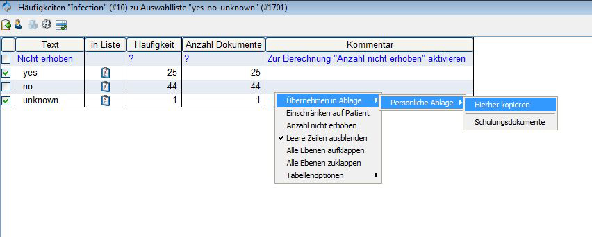 Die erhaltenen Dokumente können Sie, wie als Beispiel im nächsten Screenshot gezeigt, durch einen Rechtsklick auf die Zeile > Übernehmen in Ablage > Persönliche Ablage > Hierher kopieren zur Bearbeitung in die persönliche Ablage übernehmen.