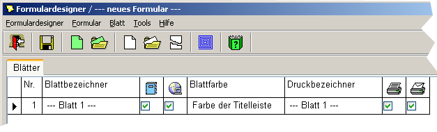 Das mittlere Feld der Tabelle gibt an, ob das Blatt einen Reiter haben soll, sodaß es direkt aus dem Stapel Blätter des Formulars angewählt werden kann.
