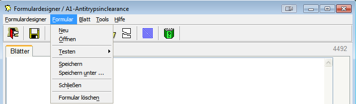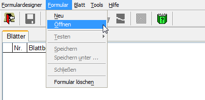 Um ein bestehendes Formular zu öffnen wählen Sie "Öffnen" im Dropdown-Menü aus