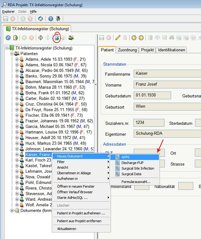 • mit der rechten Maustaste auf den Patienten > neues Dokument