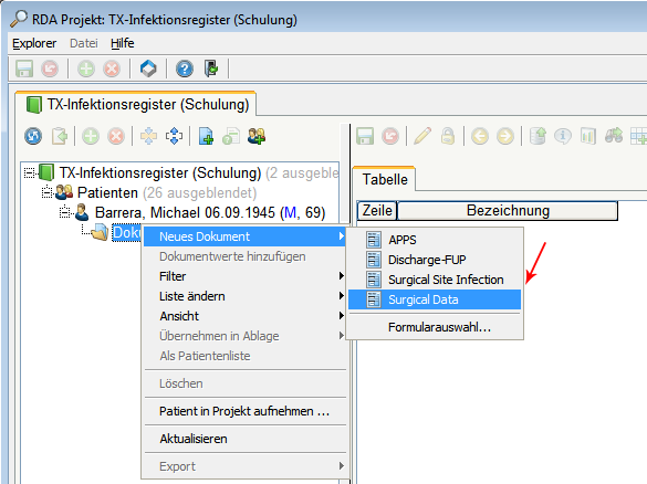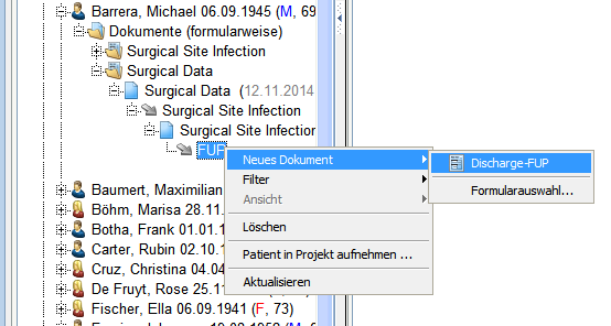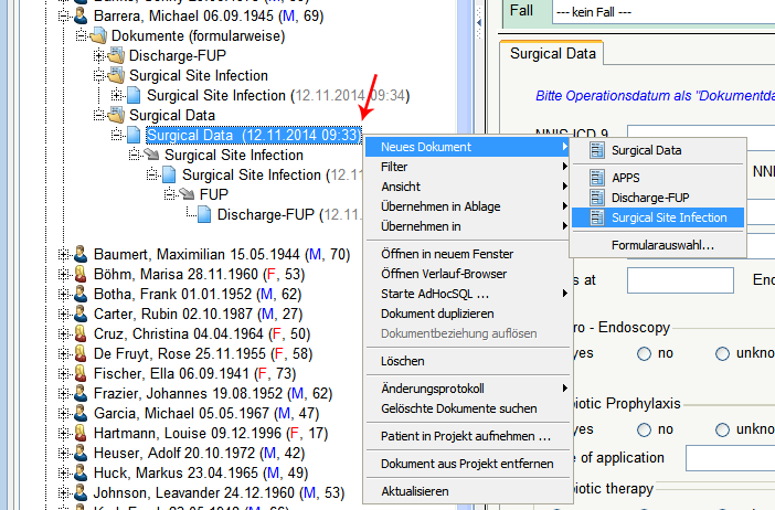 Aufgrund der vordefinierten Beziehung von "Surgical Data" auf "Surgical Site Infection" können Sie ein Dokument "Surgical Site Infection" in Beziehung zum Dokument "Surgical Data" anlegen. Klicken Sie auf das Plus links von "Surgical Data", um die durch einen Pfeil dargestellte Dokumentbeziehung anzuzeigen. Ausgehend von der gewählten Beziehung können Sie mittels Rechtsklick das neue Dokument erstellen.