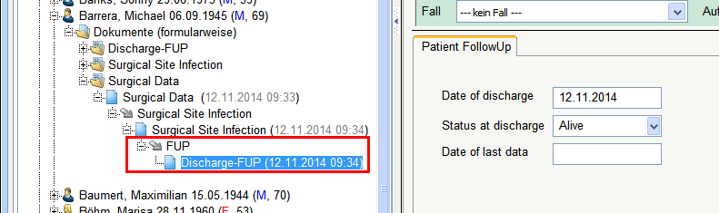 In unserem Beispiel sind zwei Dokumentbeziehungen hintereinander geschaltet: die erste von "Surgical Data" auf "Surgical Site Infection", die zweite von "Surgical Site Infection" auf das Follow Up Dokument "Discharge-FUP".