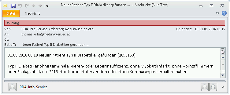 Sie haben eine prospektive Studie oder ein Register geplant? Die RDA kann Sie durch ein Benachrichtigungsservice via Email von jedem neuen Fall, der auf Basis der Kriterien für die Fallzahlabschätzung ermittelt wurde, in Kenntnis zu setzen. Beispiel für eine Benachrichtigung: