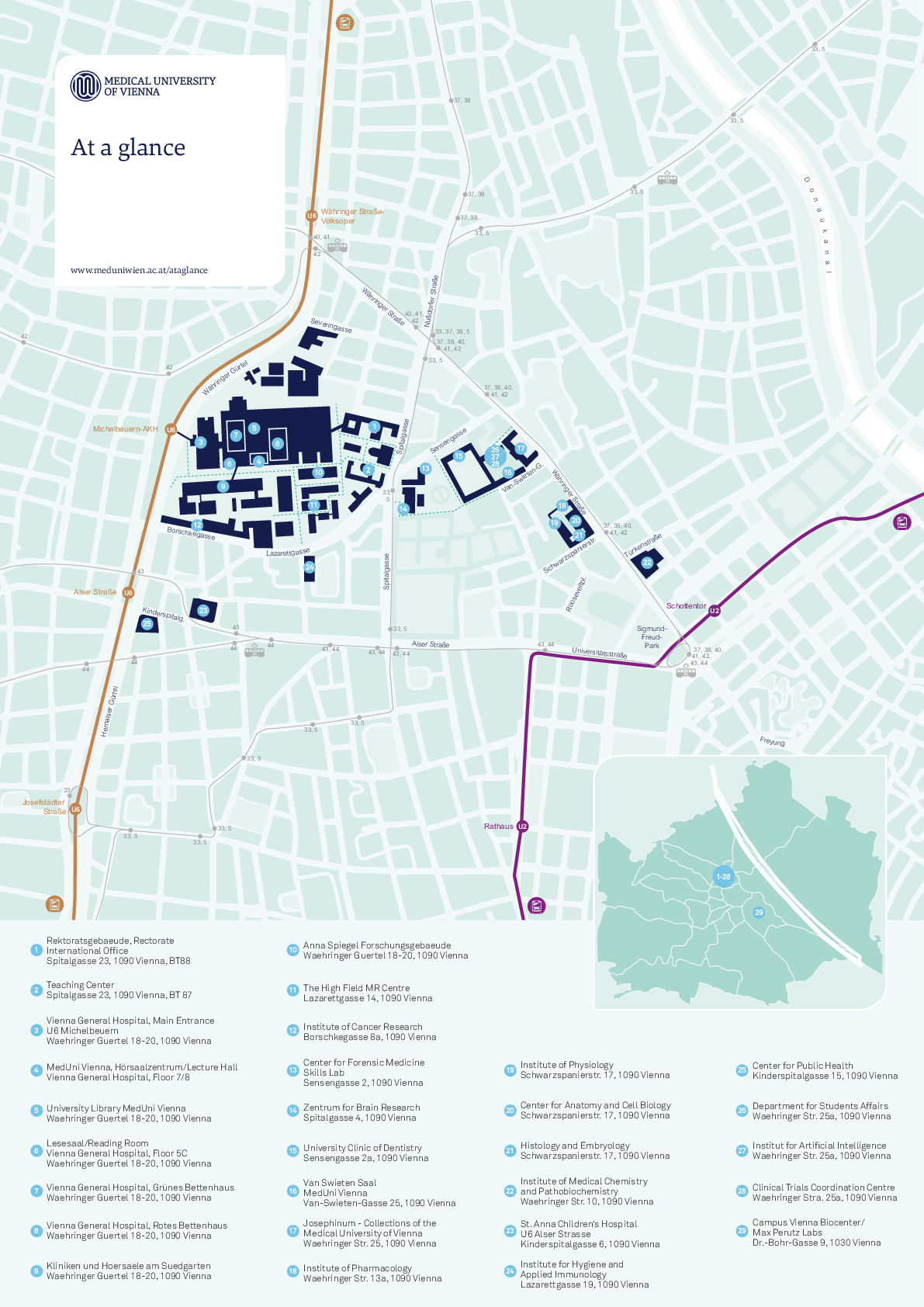 Wondering what is the quickest way to get to your next course or work place? The campus map is a useful tool for orientation, we advise you to save it to your mobile phone to have it with you when needed. Additionally, you can look up the directions to MedUni Vienna here.