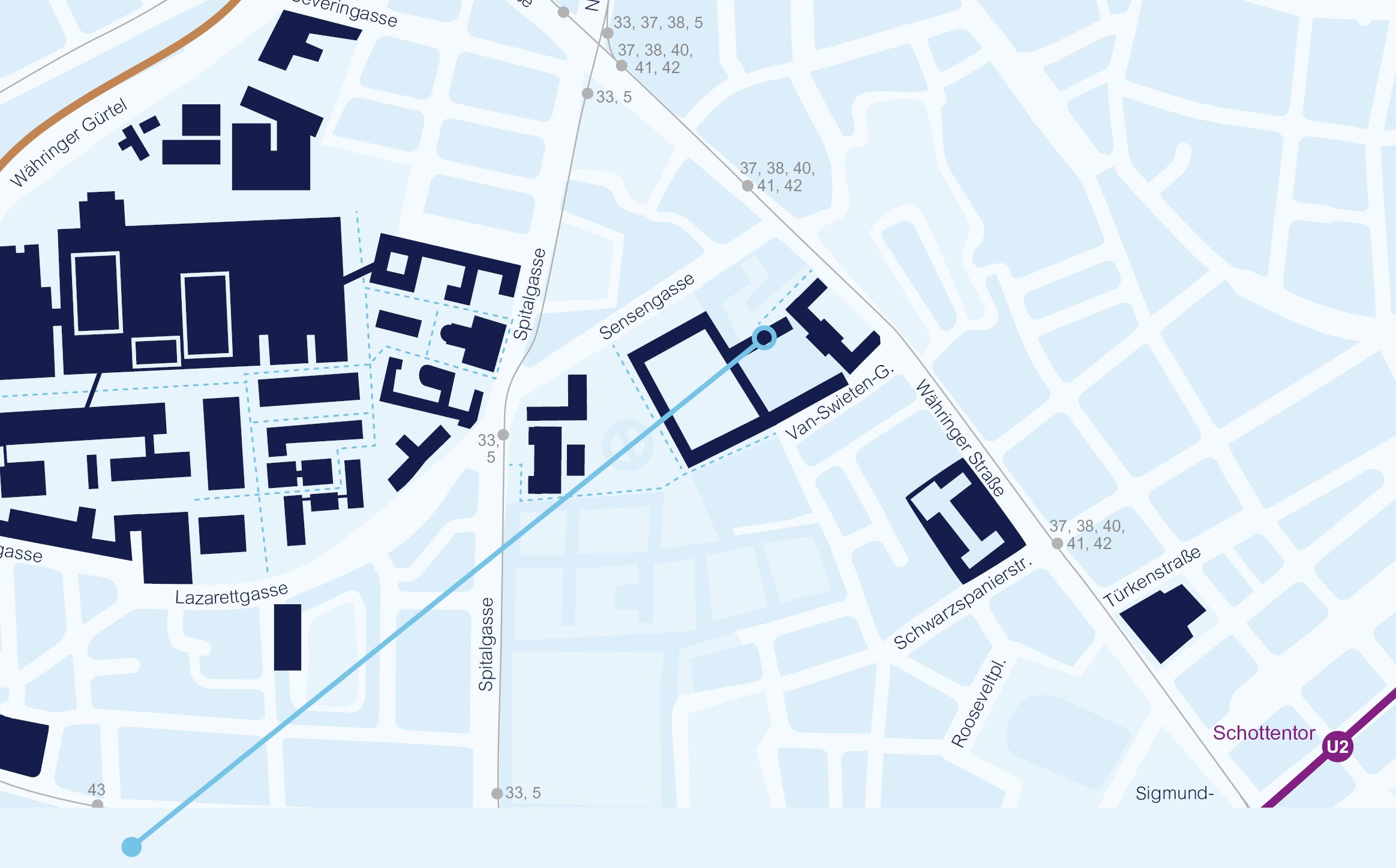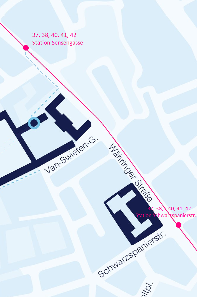- Tram lines 37, 38, 40, 41 or 42 to station Schwarzspanierstraße (coming from station Schottentor no stop in station Sensengasse)