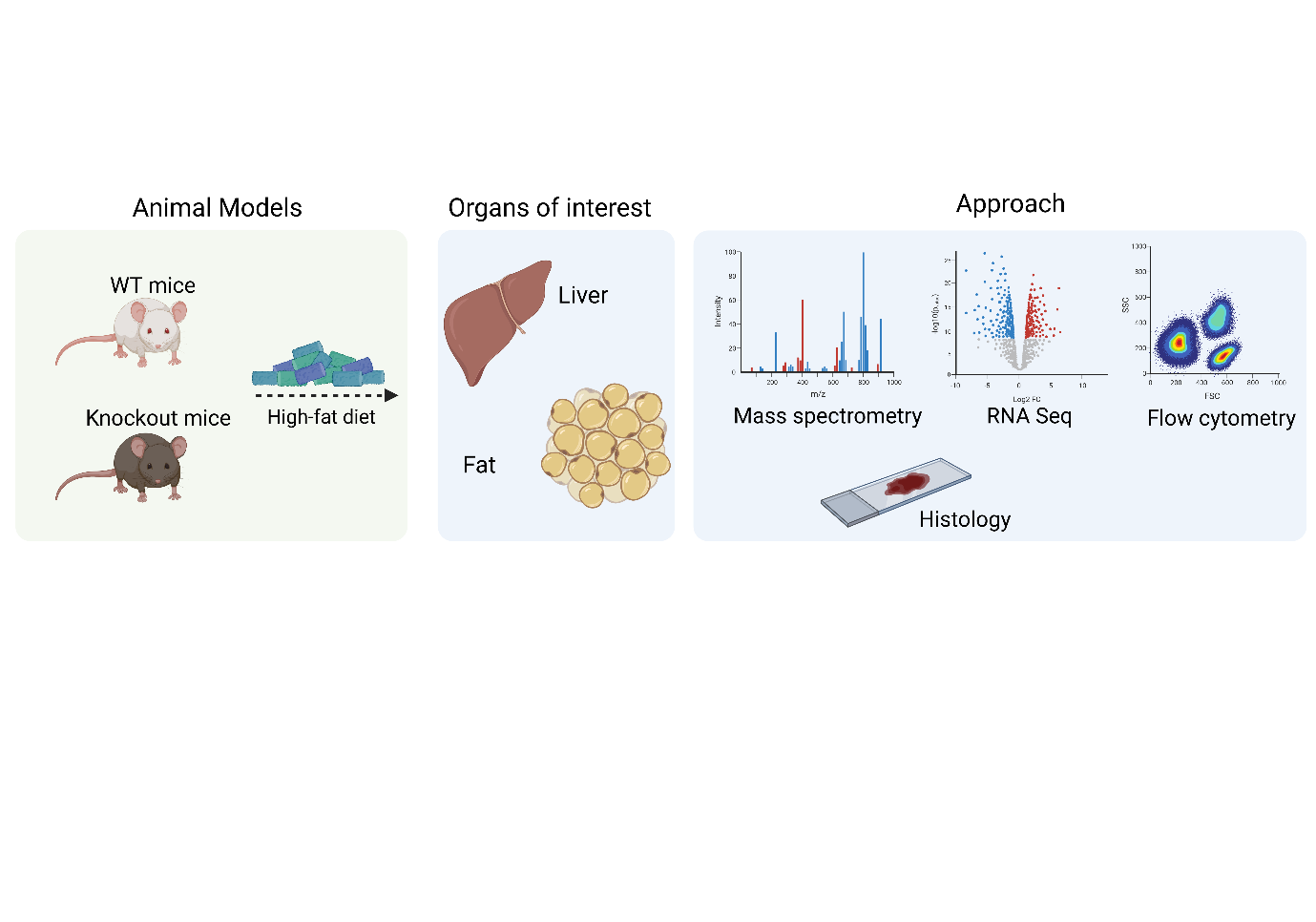 To investigate the function of these receptors, we put mice lacking these receptors on a high-fat diet to make them fat and then compare the phenotype of these mice to wild-type mice having those receptors. We then perform different approaches including flow cytometry to examine the abundance of different cell populations, mass spectrometry to check the alternations in lipids and metabolites, RNA sequencing to analyze gene expression, and different histological staining. These experimental approaches are performed in different organs, especially the liver and adipose tissue. The scheme of the experimental setup can be seen below.